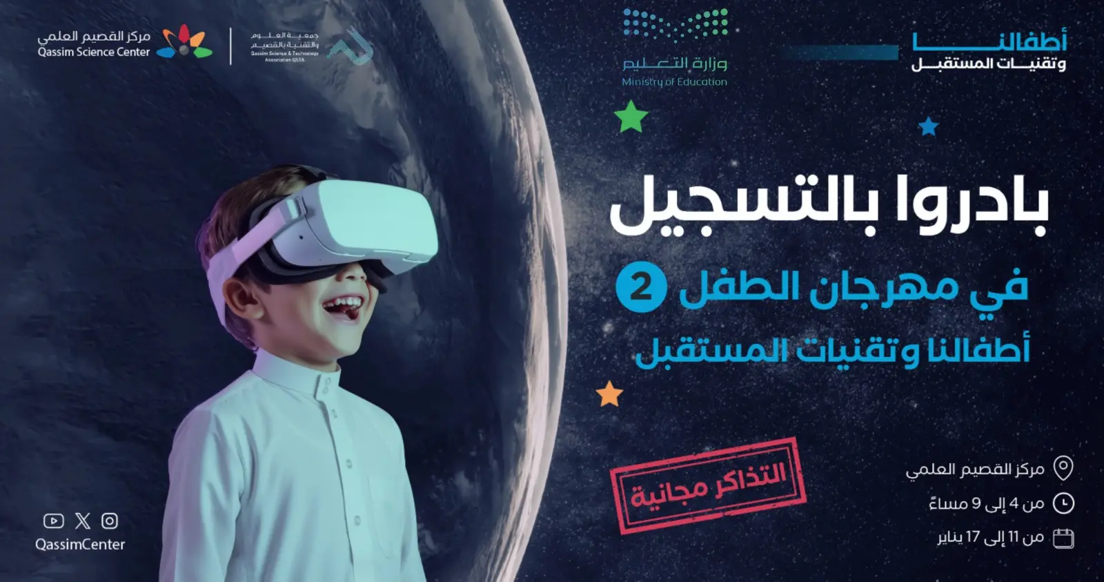 يقدّم مهرجان الطفل - النسخة الثانية (أطفالنا وتقنيات المستقبل) تجربة تعليمية تفاعلية استثنائية للأطفال والأسر، تجمع بين العلم، المتعة، الابتكار في بيئة آمنة ومحفّزة. يهدف المهرجان إلى تعريف الأطفال بتقنيات المستقبل وتنمية شغفهم العلمي من خلال التعلّم بالتجربة، والاكتشاف، والمشاركة الفعالة.