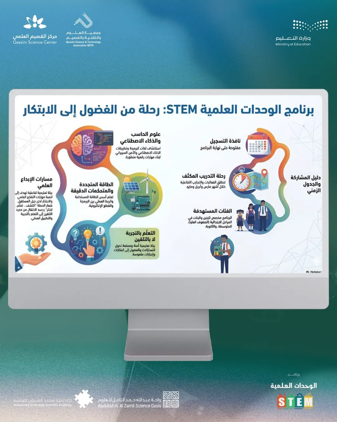 ينطلق اليوم الأحد 29 مارس 2026م، الساعة 4:00 مساءً، فعاليات برنامج الوحدات العلمية STEM، الذي تُنفِّذه جمعية العلوم والتقنية بالقصيم، المشغِّلة لمركز القصيم العلمي؛ في اكاديمية محمد الشبيلي للتدريب في رحلة تعليمية تفاعلية تنطلق من الفضول إلى الابتكار، وتجمع بين البرمجة والذكاء الاصطناعي، والطاقة المتجددة، والمتحكمات الدقيقة، ضمن بيئة تعليمية آمنة وممتعة تُنمّي القدرات، وتُطلق الطاقات، وتُعزِّز جاهزية المتعلّمين لمهارات المستقبل.