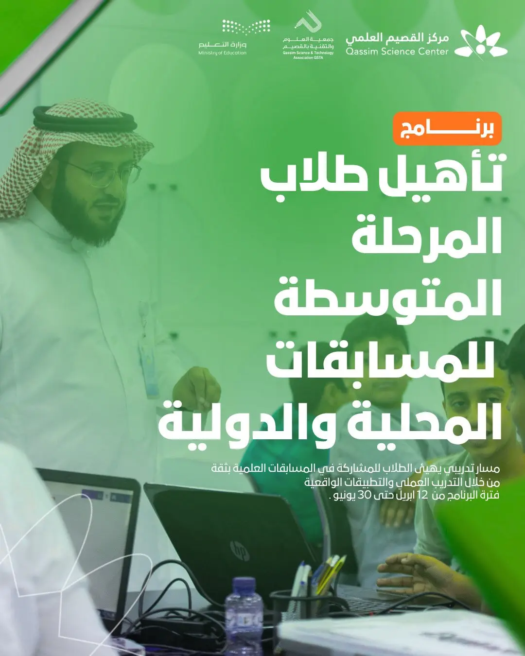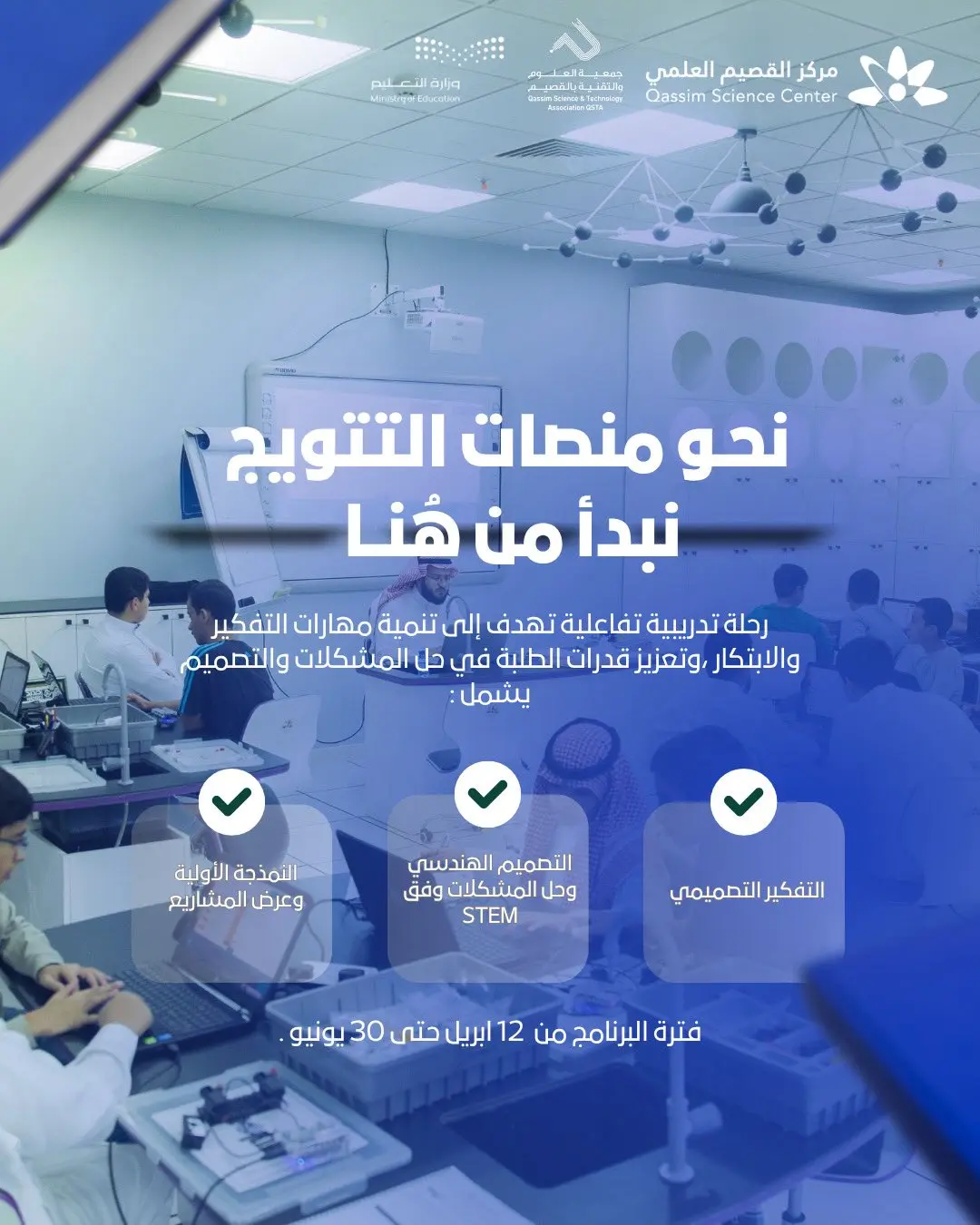 انطلاق فعاليات برنامج تأهيل طلاب وطالبات المرحلة المتوسطة للمسابقات المحلية والدولية، في رحلة تدريبية تفاعلية تهدف إلى تنمية مهارات التفكير والابتكار، وتعزيز قدرات الطلبة في حل المشكلات والتصميم؛ بما يؤهلهم للمنافسة بثقة وتميّز على المستويين المحلي والعالمي. ويجمع البرنامج بين التفكير التصميمي ومنهجيات STEAM، إلى جانب النمذجة الأولية وعرض المشاريع، ضمن بيئة تدريبية محفّزة تُنمّي القدرات وتعزّز جاهزية المتعلمين لمهارات المستقبل. ويُنفَّذ البرنامج بواسطة جمعية العلوم والتقنية بالقصيم، المشغّلة لمركز القصيم العلمي.